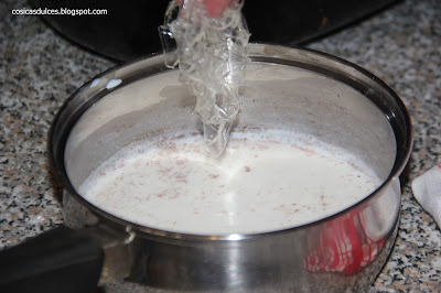En la leche que tenemos en el cazo disolvemos, una vez que ha hervido, la gelatina previamente hidratada.